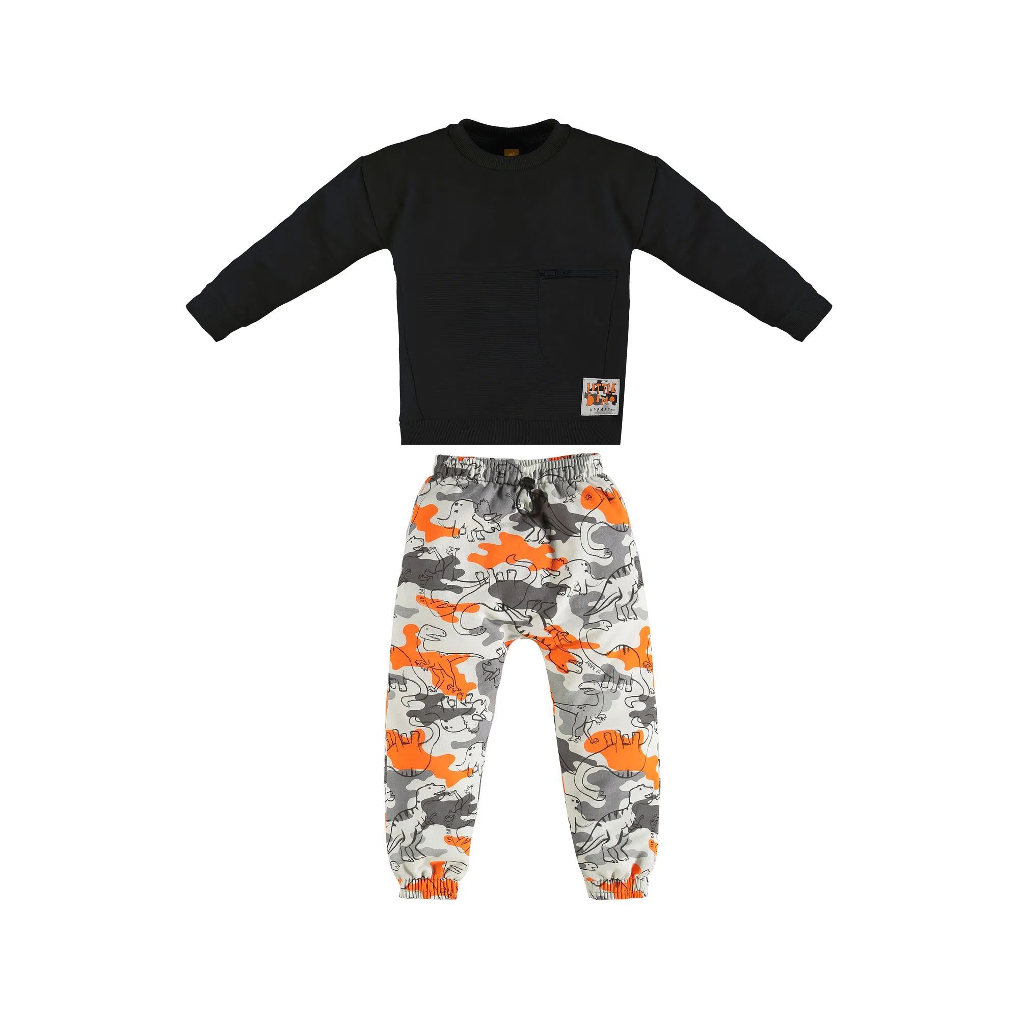 Conjunto infantil masculino de inverno, conta com um blusão e uma calça. O blusão é confeccionado em moletom sem felpa e gorgurão, com gola redonda com filete, ombros deslocados e recorte, bolso com zíper, punhos e barra. Ele é perfeito para aqueles dias em que você quer que seu filho fique quentinho e elegante. Já a calça é confeccionada em moletom sem felpa, com elástico na cintura e nos punhos, caseado com elástico e focinho de porco. O destaque fica por conta da estampa de dinossaurinhos com detalhes parecidos com camuflado, que deixa a peça ainda mais divertida.