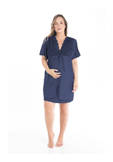 O conjunto de camisola confeccionada em microfibra de poliester, tecido de alta qualidade com toque gelado, que proporciona conforto. Possui click na alça que facilita na amamentação e detalhe em renda no decote. O robe possui detalhe em renda no decote e vies para fechamento e manga curta. Possui o toque leve e perfeito para fazer ensaio também. So colocar a lingerie e com o robe pode fazer varias poses e tambem disfarcar para as mães que gostam de expor menos.