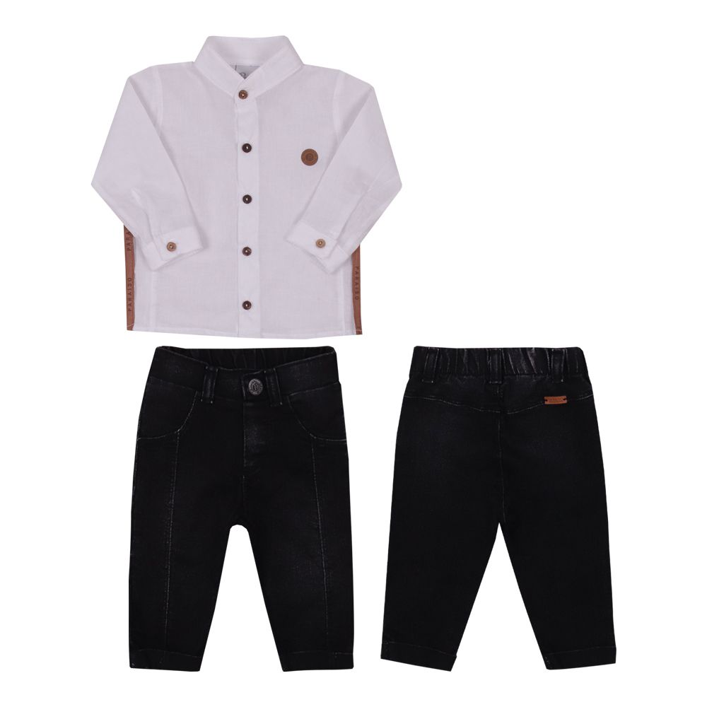 Modelo: Conjunto masculino bata manga longa e calça Jeans, bata com abertura de botão e calça com cós de elástico.