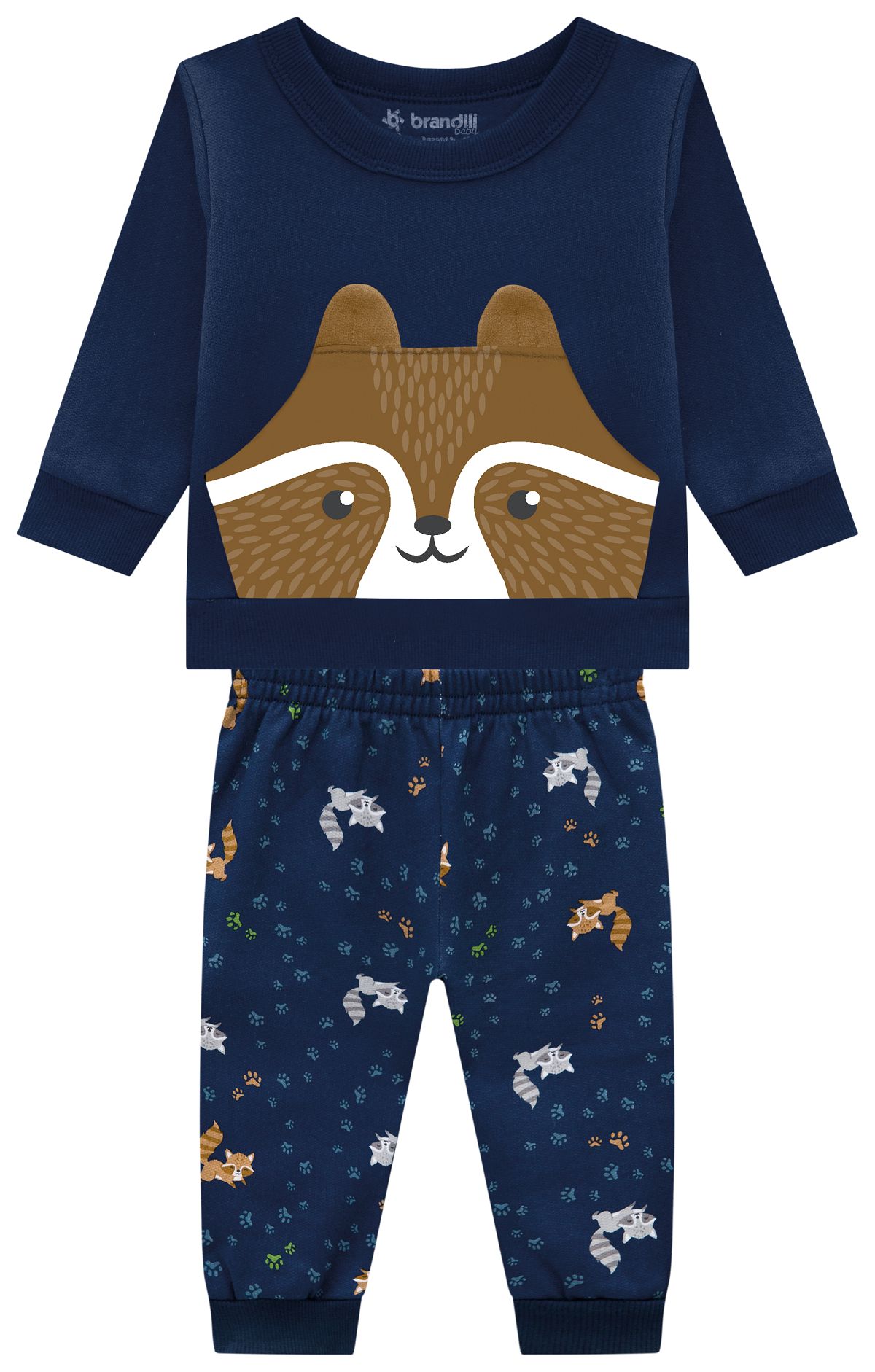 Coonjunto composto por blusa em moletom peluciado na cor azul marinho com bolso frontal e estampa em puff e calça em moletom peluciado na cor azul marinho estampada.