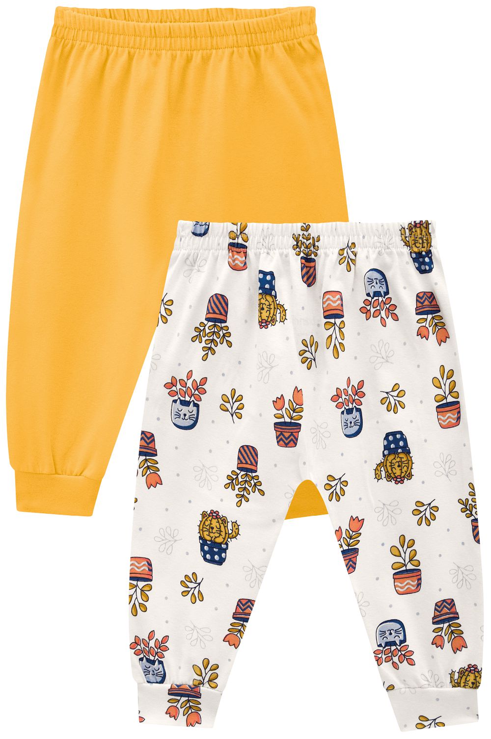 Kit de calças jogger bebê menina confeccionadas em cotton com estampa de plantinhas, em uma delas possui aplique bordado com malha de cacto na parte de trás. Aposte nesse kit cheio de estilo e fofura!
