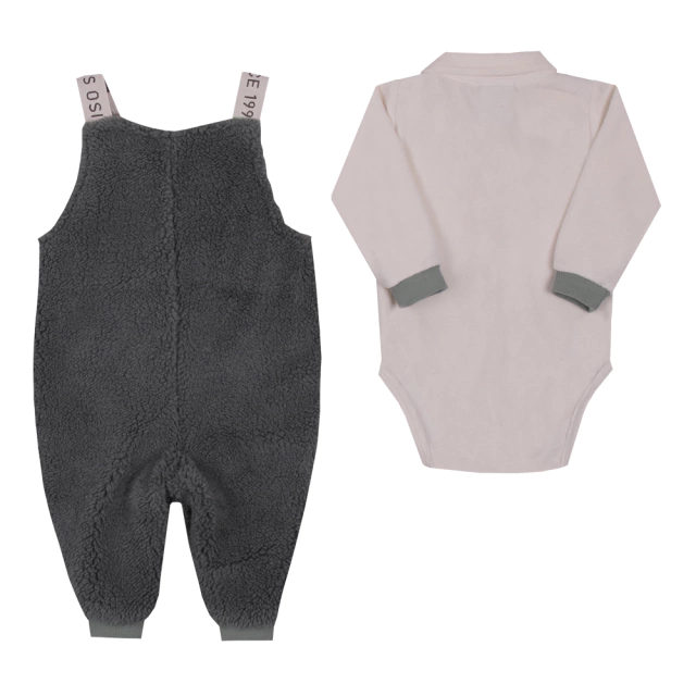 Modelo: Macacão longo duas peças estilo jardineira com body, jardineira de pelo com alças de galão, detalhe de argolinha e plaquinha personalizada, body de plush com abertura de botões. Look moderninho e estiloso, para seu príncipe encantar à todos. Produzido nos tamanhos RN-P-M-G.