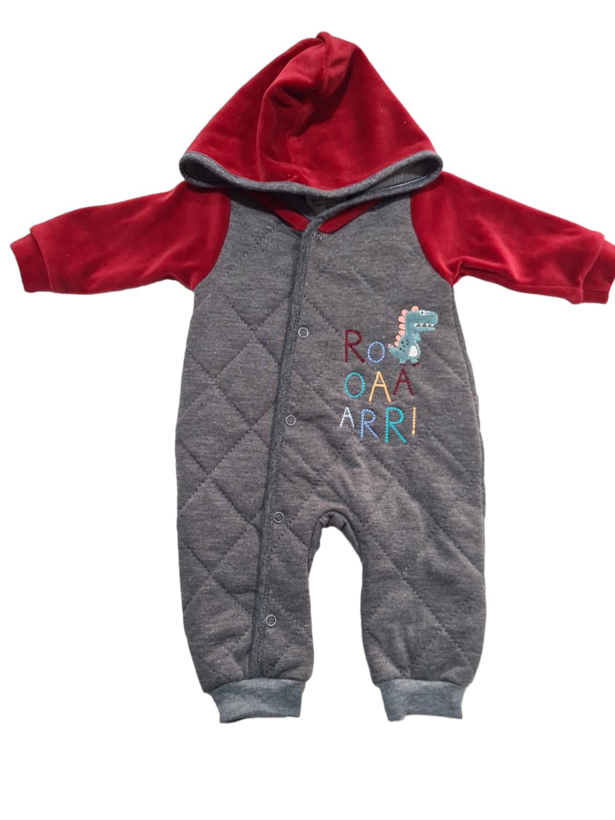 Macacão longo mantado c/ capuz baby gijo bordado dino menino cinza/ vermelho