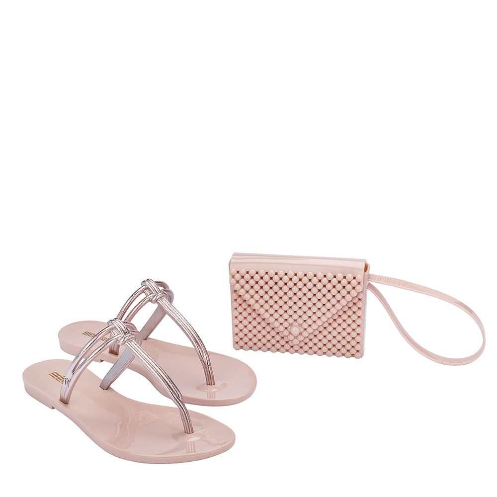 A Melissa Astral Chrome vem com tiras delicadas, onde o formato levemente tubular encontra o acabamento metalizado. A bolsa fashion que acompanha o combo possui formato pocket, com superfície em 3D de textura que imita pérolas.
