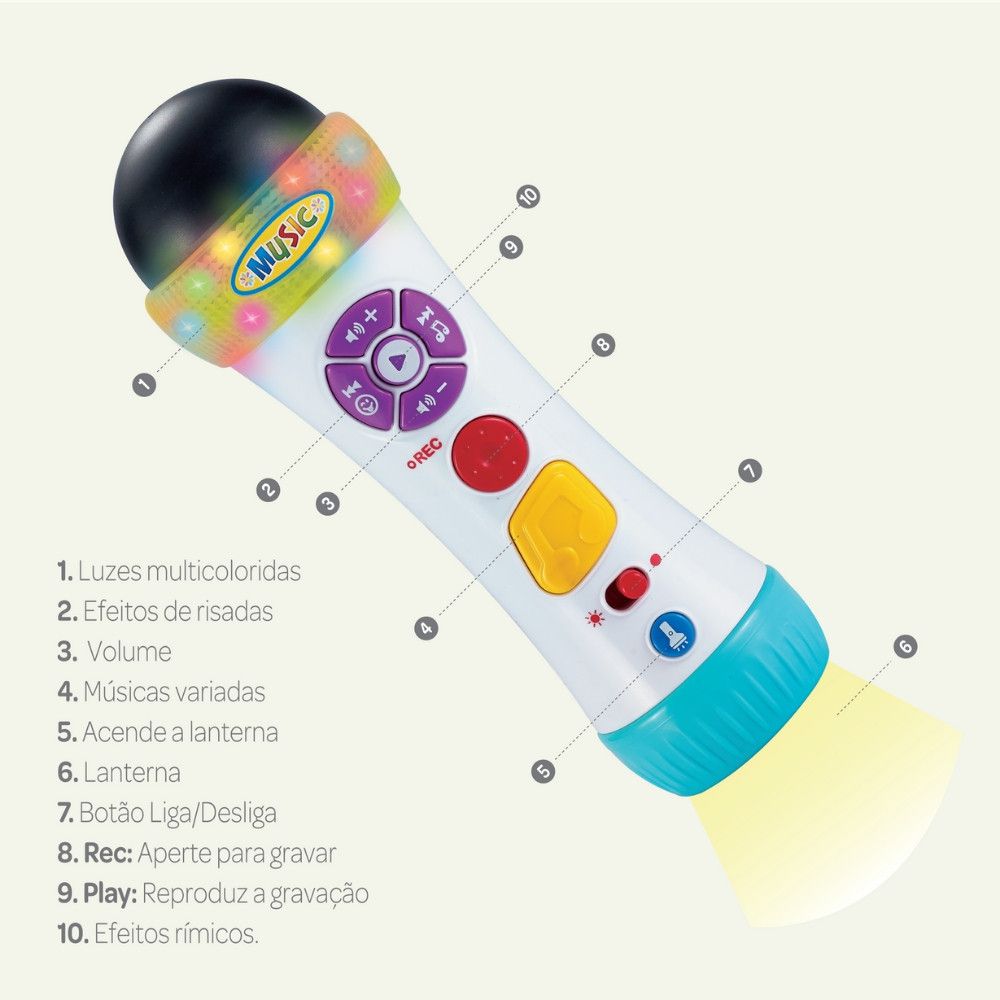 É hora de se divertir! A linha Buba traz itens pensados com muito carinho para o seu bebê. Através de cores, formas, texturas e sons, estimula todos os sentidos, contribuindo para o crescimento saudável da criança. O Microfone Musical, além de super colorido e divertido, possui luzes multicoloridas, efeitos risadas, volume, músicas variadas, efeitos rítmicos, reprodução da gravação e uma lanterna, desenvolvendo a criatividade do seu bebê durante as brincadeiras. Estimula a visão, o tato e a audição do seu bebê.