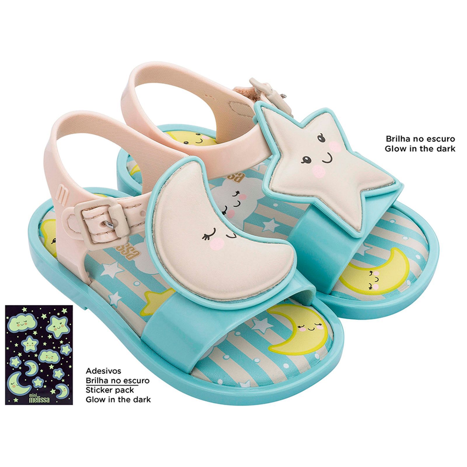 Na coleção Sweet Dreams o shape da Mini Mar Sandal vem com um tom lúdico na presença de aplicações em formato de lua & estrela que brilham no escuro! Destaque para a paleta de cores versátil, ótima para tdxs xs pequenxs e para a cartelinha com adesivos que brilham no escuro e que acompanha os produtos da coleção.