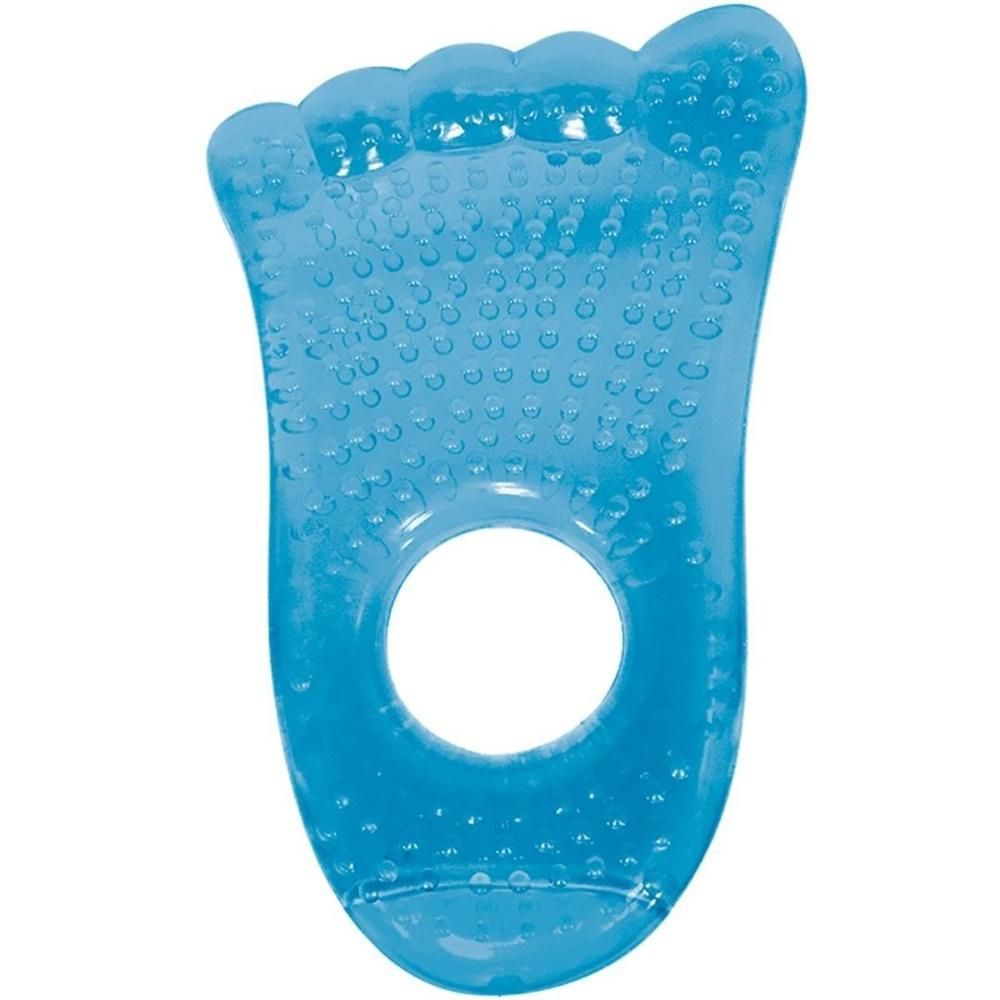 O interior do mordedor contém água. Ao ser resfriado na geladeira, o mordedor gelado proporciona uma sensação de alívio e frescor para o bebê.