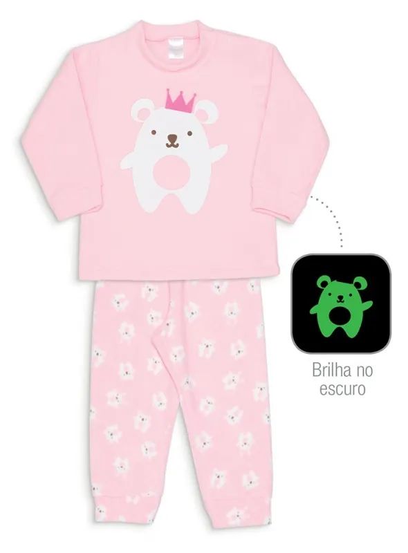 Conjunto de soft estilo pijama quentinho para bebê menina composto por calça rosa e estampa rotativa de bichinhos de pano e blusa rosa, com botões no ombro e estampa localizada, à base d'água e não tóxica de bichinho de pano.
