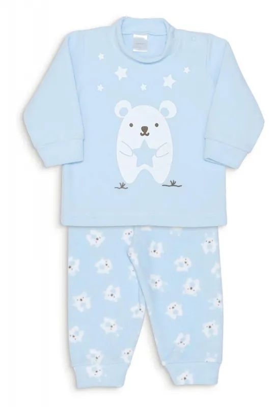 Conjunto de soft estilo pijama quentinho infantil para menino composto por calça azul bebê e estampa rotativa de bichinhos de pano e blusa azul bebê, com botões no ombro e estampa que brilha no escuro, localizada, à base d'água e não tóxica de bichinho de pano no avião.