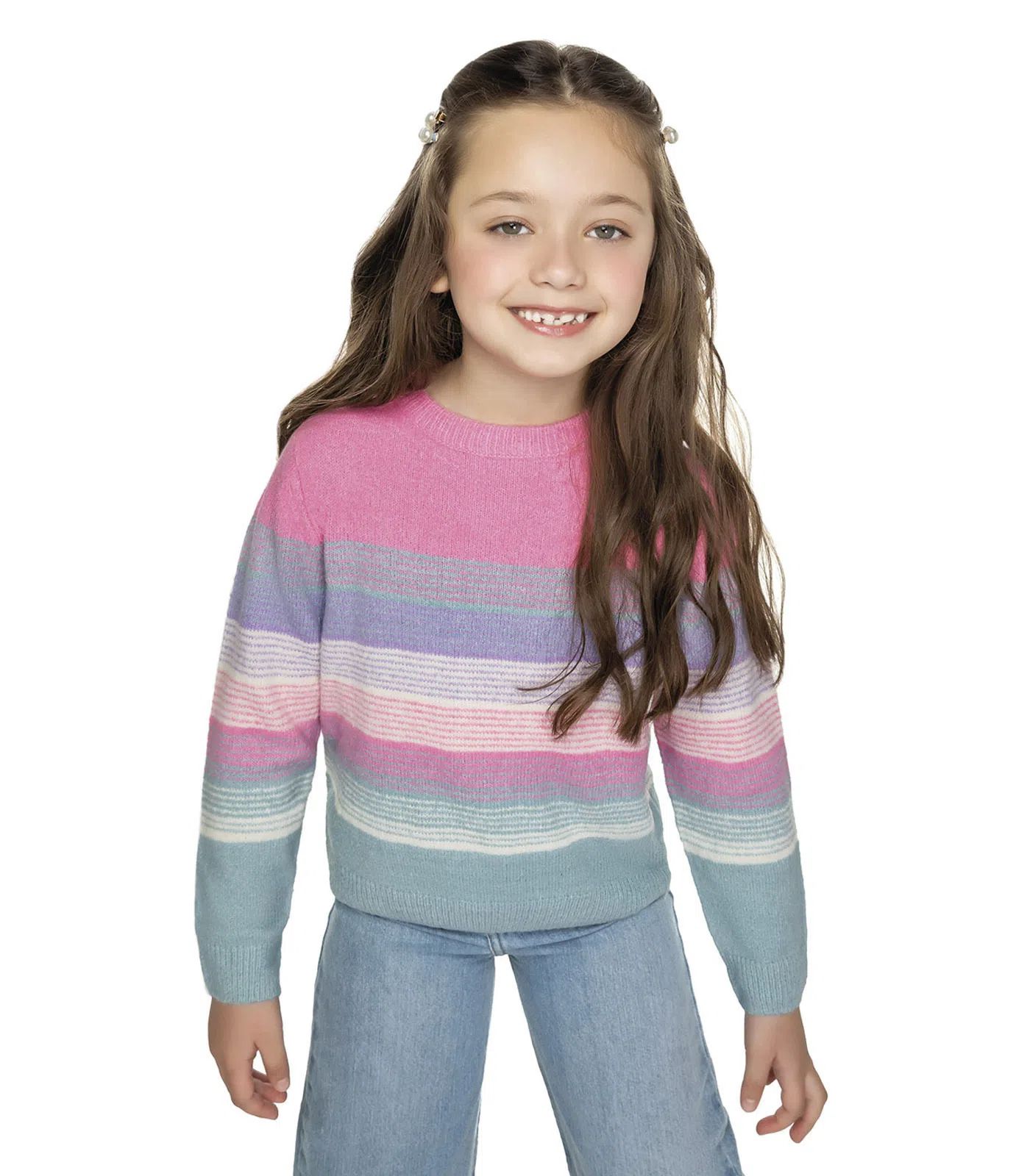 Sueter Infantil Listras Trick Nick feito em tricot um tecido macio e elástico, que é conhecido por sua textura aconchegante e capacidade de manter o calor. O suéter pode ser usado com uma camisa ou camiseta por baixo, ou sozinho, dependendo das condições climáticas.